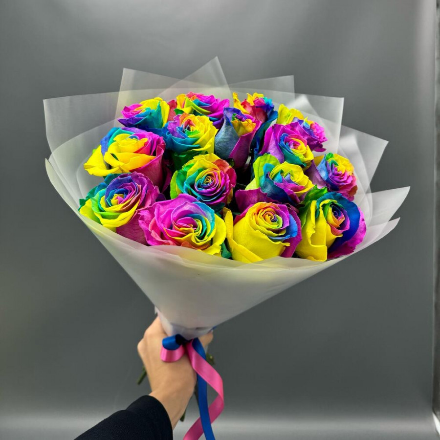 Лента атласная - 3 шт. Кризал (подкормка) - 1 шт. Открыточка с вашими пожеланиями - 1 шт. Дизайнерская упаковка - 1 шт. радужные розы - 15 шт.