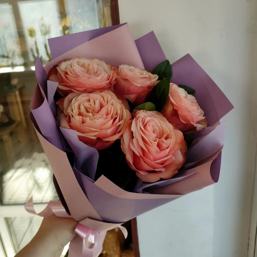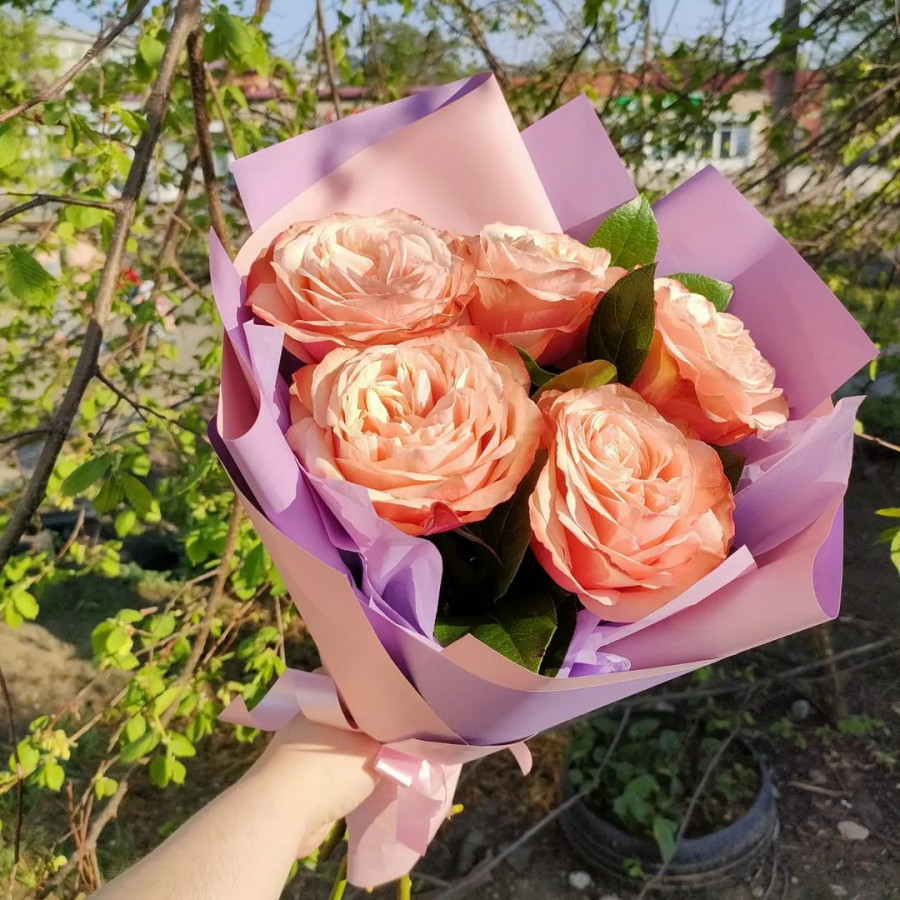 На фото букет из 5 оранжевых одноголовых пионовидных роз. В составе: пионовидная роза 5 шт, крафт-бумага 1 шт, атласная лента 1 шт, . Все цветы свежие и ароматные, букет красиво оформлен и отлично подходит для подарка. Доступна доставка цветов или самовывоз.