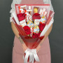 Роза одноголовая - 7 шт. Лента атласная - 1 шт. бумага дизайнерская - 6 шт. конфеты киндер палочка - 5 шт. конфета киндер сюрприз - 3 шт. конфета киндер буэно - 2 шт. конфета киндер кантри - 2 шт. конфета батончик нутелла - 1 шт.